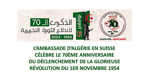 06.11.2024 - L'Ambassade d'Algérie à Berne a célébré le 71ème anniversaire du déclenchement de la guerre de libération nationale en présence du corps diplomatique à Berne, des autorités helvétiques et des membres de la Communauté nationale établie en Suisse.
