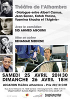 23.04.2009 - L'Association Suisse-Algérie-Harmonie organise un spectacle de théatre "Dialogue entre Albert Camus,Jean Senac, Kateb Yacine,Yasmina khadra et l’Algérie", avec le comédien Sid-Ahmed Agoumi et mis en scène par Benamar Médiène samedi 25 avri et dimanche 26 avril 2009 au théâtre de l'Alhambra à Genève.
