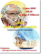 08.06.2009 - L'Association AlDjazair organise un diner Samedi 13 Juin à son siège sis Chemin des batailles 22, 1214 Vernier. L’hommage est rendu à la chanson chaouie , sahraouie et Gnawi (Projection) autour d'un dîner dont le plat principal est une' checkhchoukhet lebsakra'